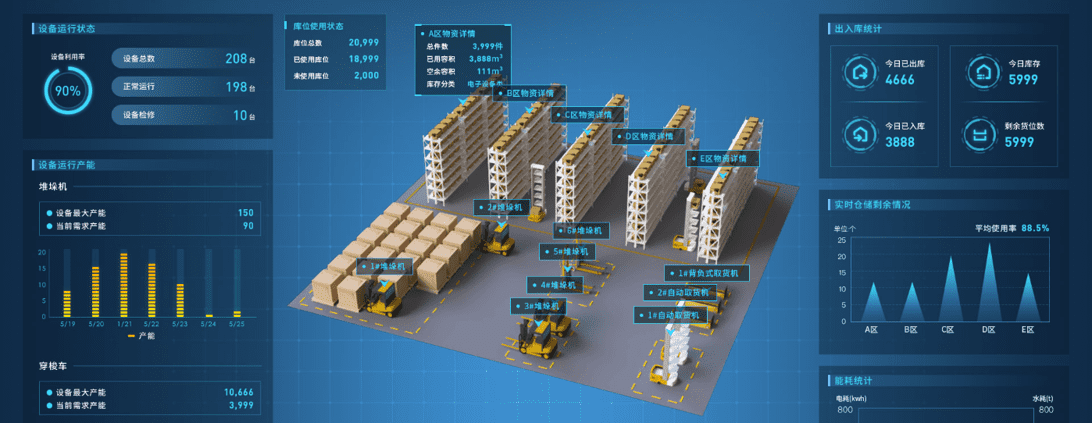 实现货品从入库-仓储-出库的全过程可视化监控,三维实时同步仓储作业过程,全流程监测和分析月台收货、机械码盘、堆垛入库、堆垛出库、机械拆盘等作业环节,辅助管理者全面掌控仓储综合运行态势。